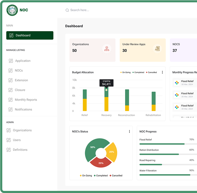 Additionally, it facilitates project monitoring by linking approved NOCs with real-time progress tracking, automated reminders for updates or extensions, and alerts for delays or non-compliance.
