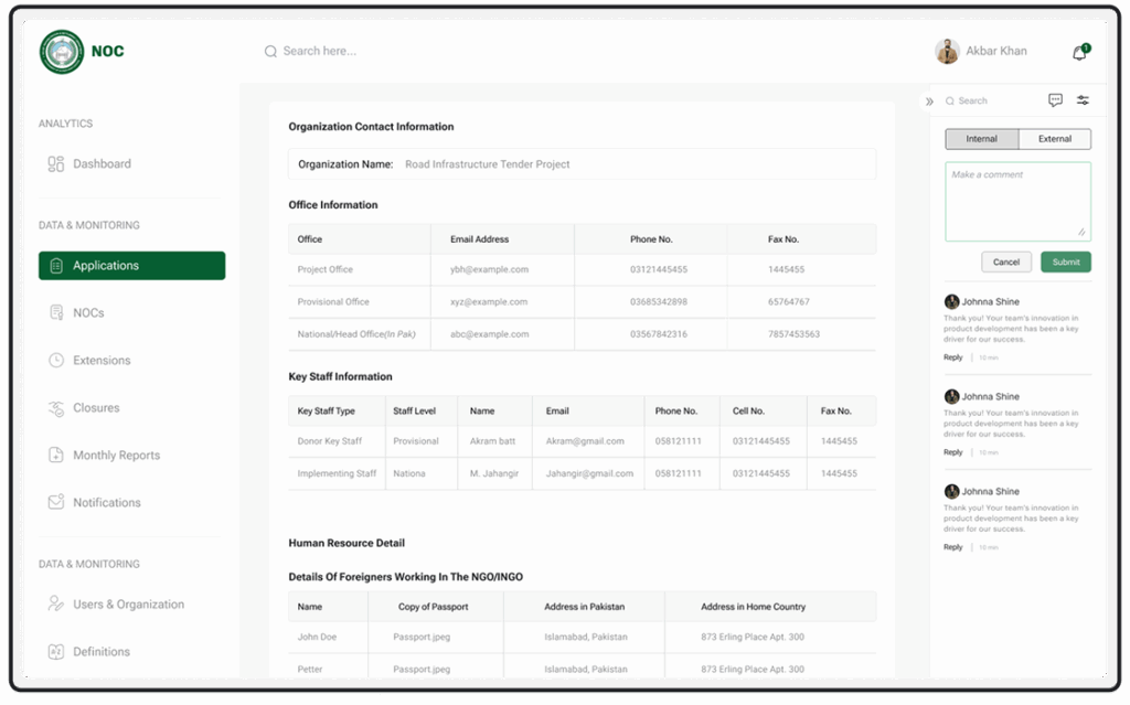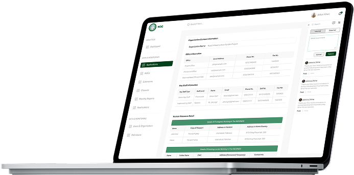 The KP NOC system offers a streamlined solution for managing NGO project approvals, extensions, and compliance monitoring. By automating the submission, review, and approval process, the system enhances transparency, reduces administrative delays, and ensures regulatory compliance. Integrated project tracking, automated notifications, and real-time status updates.